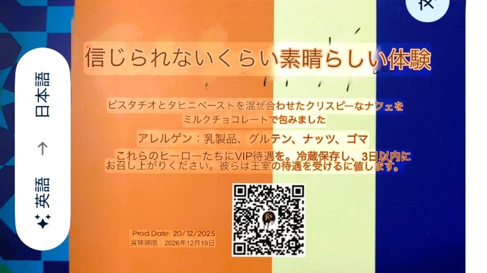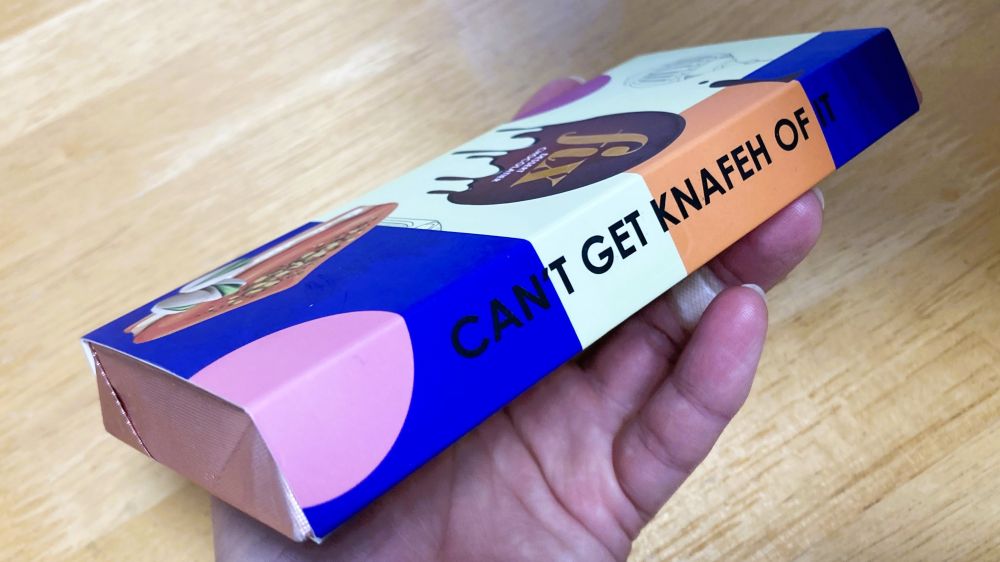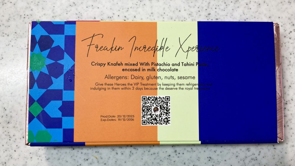 すると、1枚約7,000円。現地ガイドさんも言っていましたが、FIXのチョコレートは、ドバイモールなどの店舗では値段が高いそうです。ただ、ガイドさんが注文してくれたのは代表作の「Can’t Get Knafeh of It」(ピスタチオとタヒニ入りクリスピー・クナーフェ、ミルクチョコレート)1種類のみでしたが、ドバイモールではいろんな種類のチョコレートが売っていて見ていて楽しかったです。